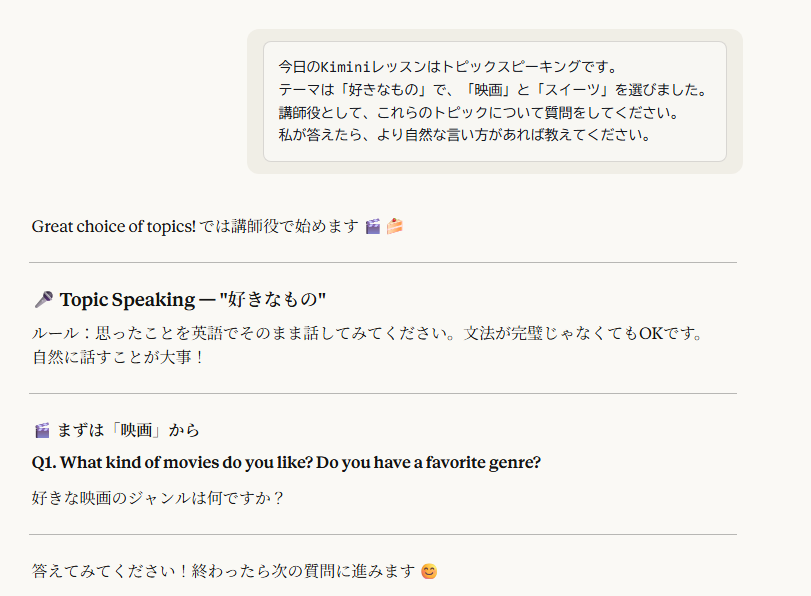 テーマが変わっても、「意見を言う→理由を添える→具体例を出す」という会話の型は共通です。AI予習を続けることで、この型が体に染み込み、どんなテーマでも発話しやすくなっていきます。最初の2〜3週間は効果を感じにくくても、継続することで変化が現れます。