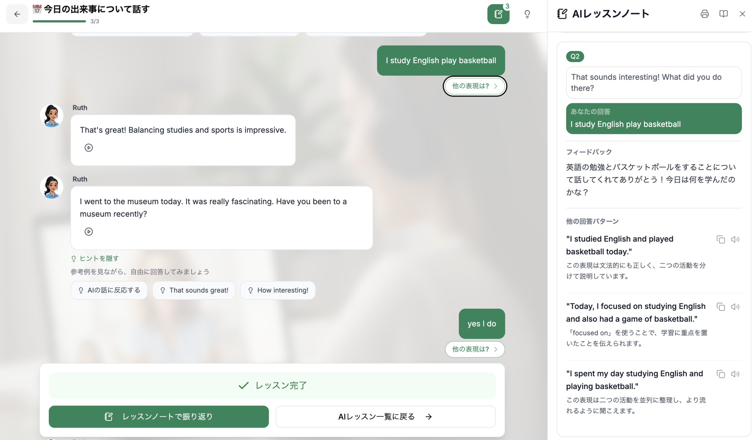 文法を直してくれるだけでなく、「spent my day〜ing(1日を〜して過ごした)」という表現が自然に加えられています。自分では思いつかなかった言い回しが、会話の流れの中でポンと出てくる感覚は新鮮でした。
