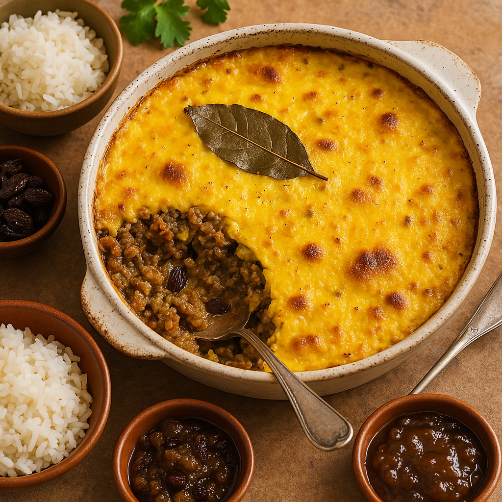 ボボティーは、スパイスの効いたひき肉と甘みのあるアクセントが特徴的な南アフリカの伝統料理です。
