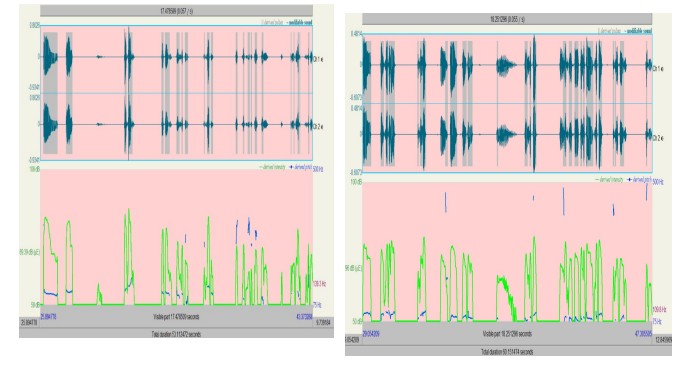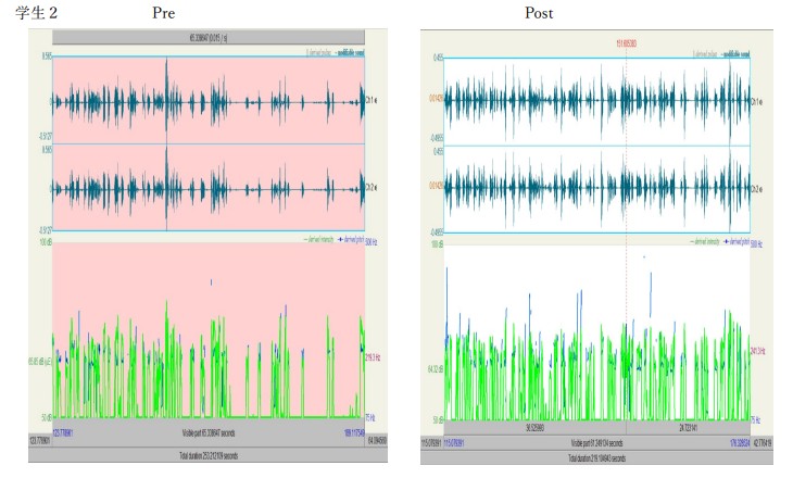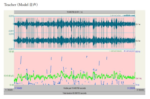実際データをみると、英語講師の音声データは緑の線が下の方にある一方で、生徒さんたちは緑の線について常に高く出てしまっていることが分かります。