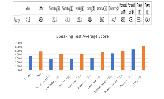 またより細分化したデータをみると、語彙力(Vocabulary)や聴く力(Listening)。文法(Grammer)も全体的にスコアアップしていることが分かります。