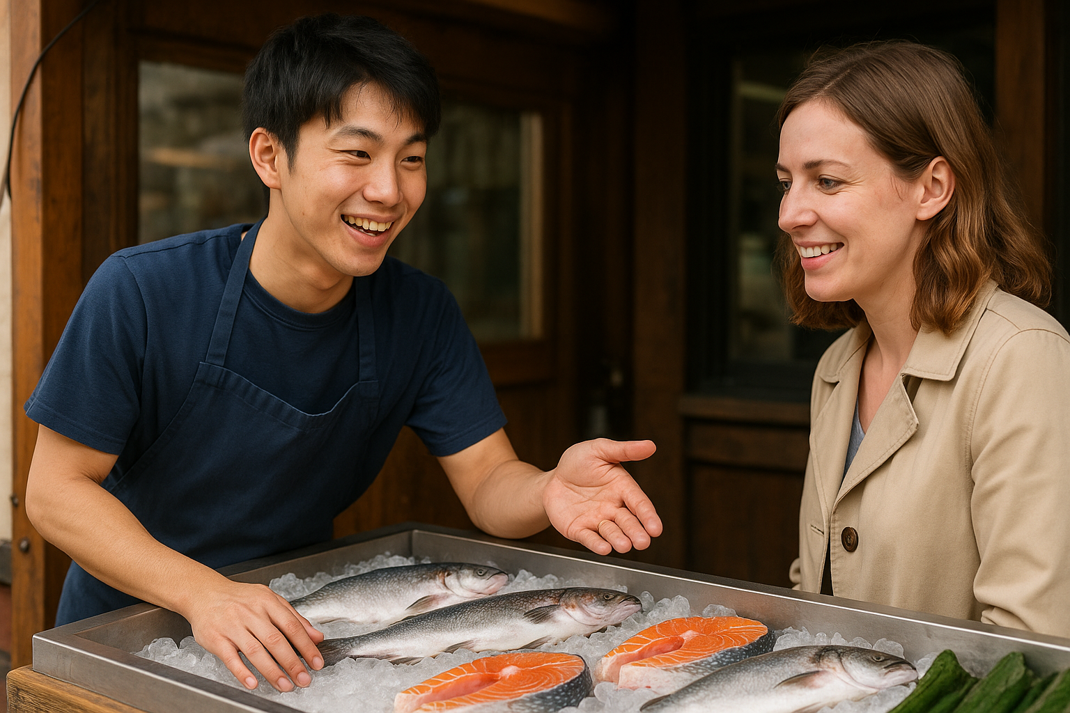 この記事では、魚屋店員として使える基本的な英単語・フレーズに加え、実際の接客シーンを想定したロールプレイ(会話例)をわかりやすくご紹介します。