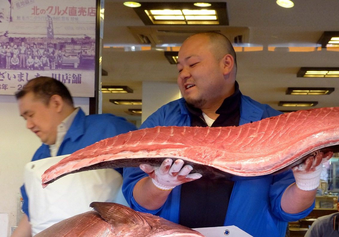(このマグロは刺身にできます。とても新鮮ですよ!)