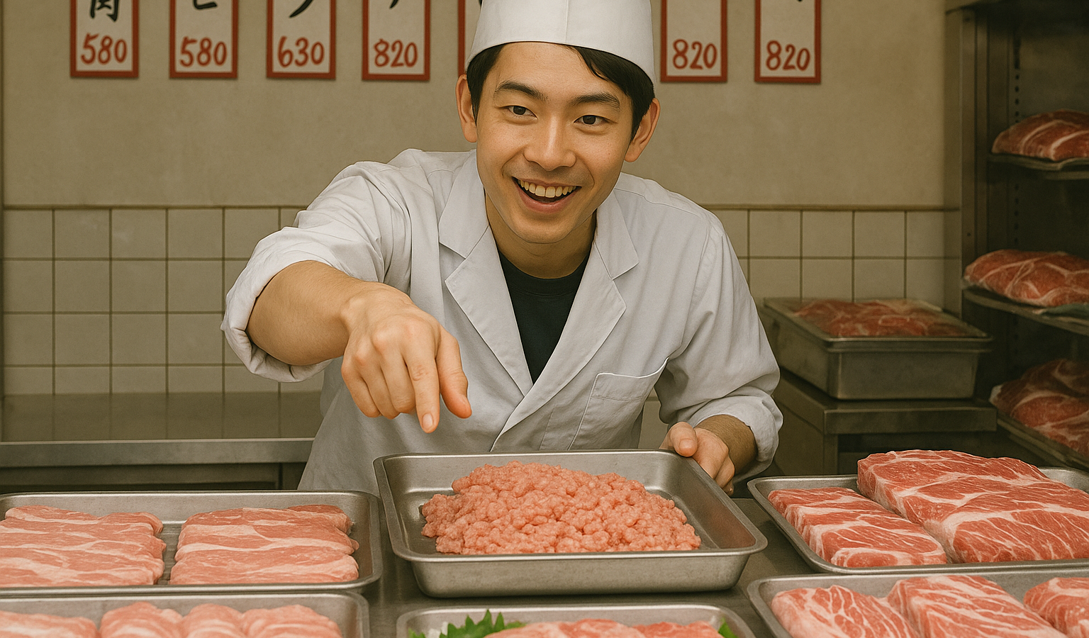日本の精肉店では、親しみのある声かけと丁寧な商品説明が大切にされています。
