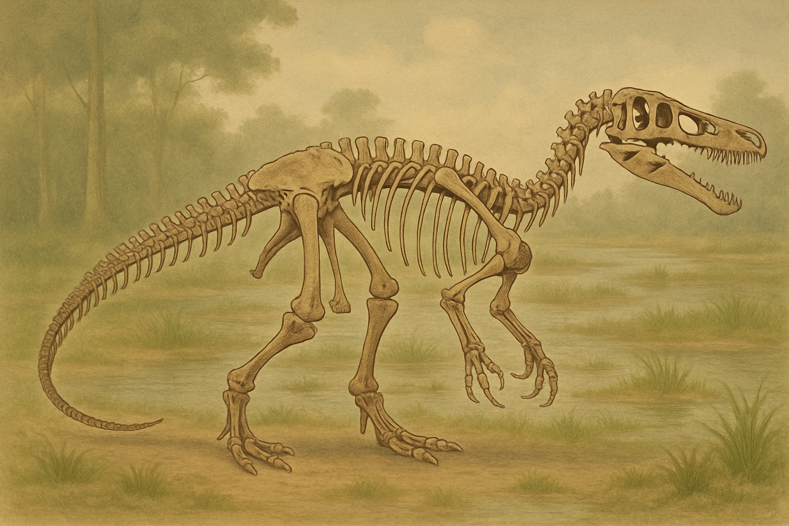 当時は湿地や洪水原が広がり、魚などの水生生物が豊富に存在していたと考えられています。川や湖がたくさんあって、まるで現在のアマゾン川流域のような、水と緑に恵まれた場所だったのでしょう。