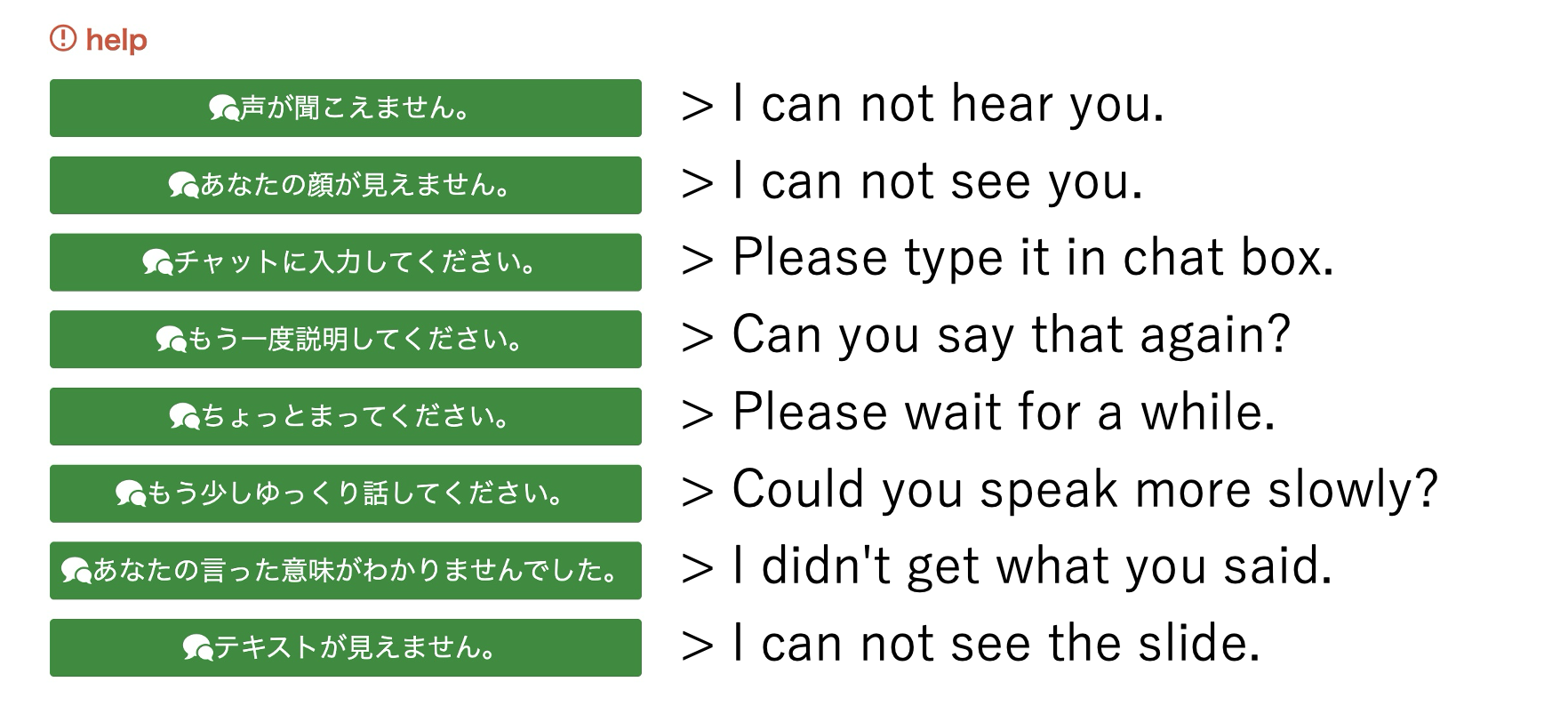 「!HELP」を押すと日本語が表示され、 選んでクリックした内容が、チャットボックス内に英語で講師に送信されます。