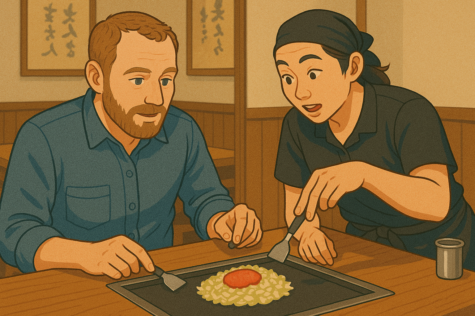 もんじゃ焼き屋では、具材の説明や焼き方の案内、食べ方のサポートまで英語で対応することが求められます。