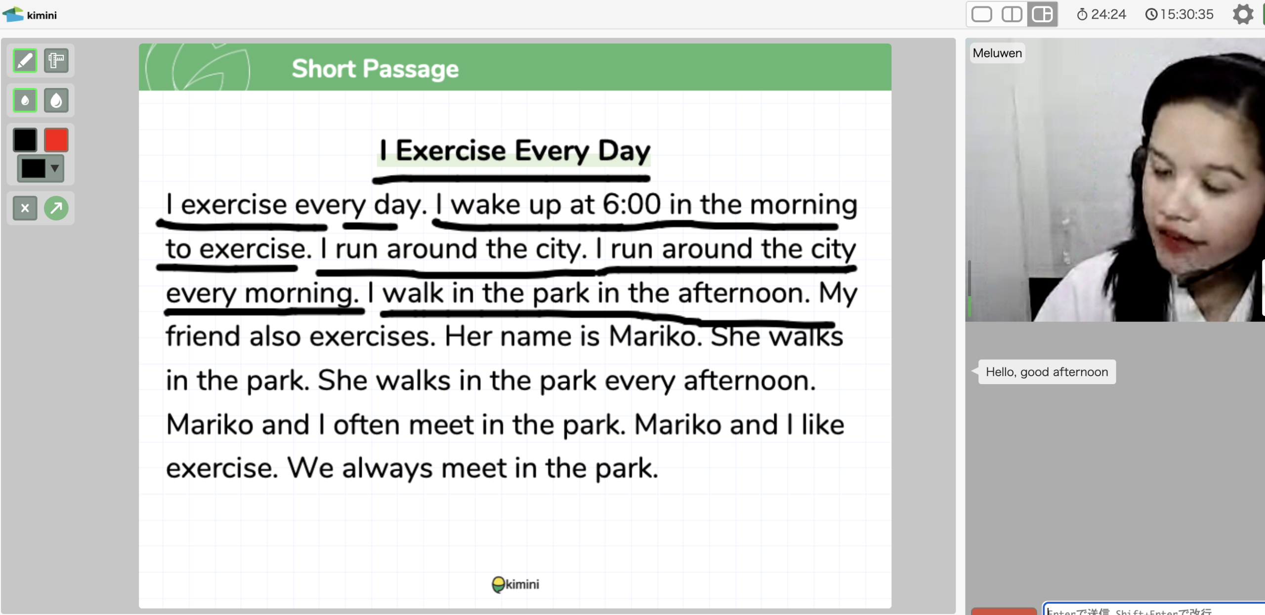 講師からたくさんの質問が投げかけられましたが、その多くが短いフレーズや一言で答えられる内容だったので、プレッシャーを感じることなくテンポよく受け答えができました。