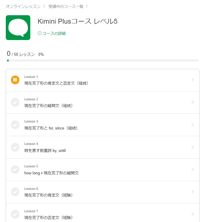 「Kimini Plusコース レベル5」のレッスンは、全50回。