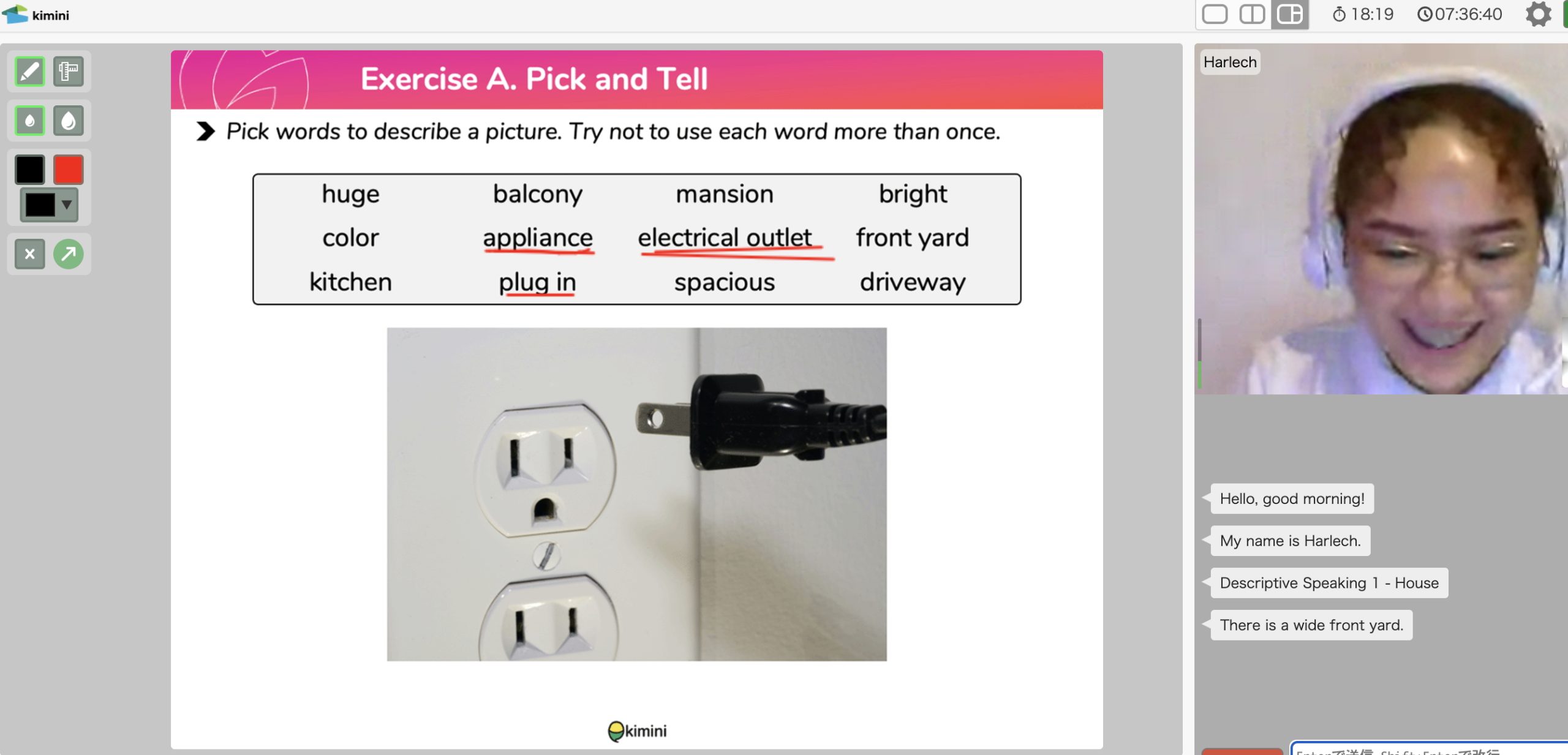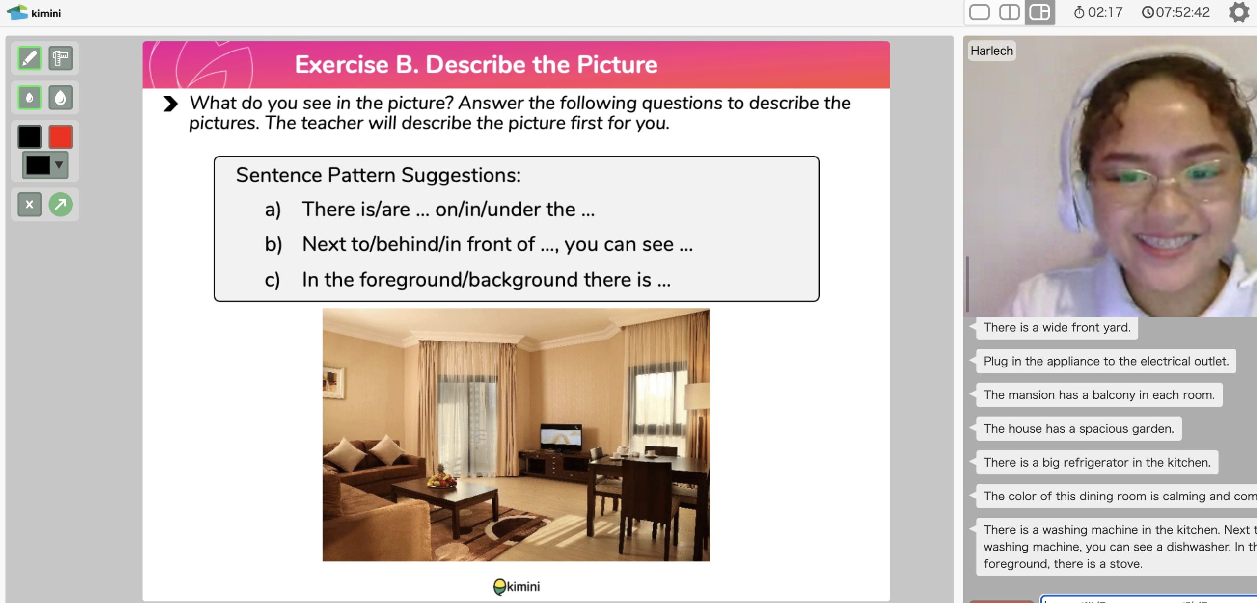 まずはエクササイズAで、写真を見ながら描写したり、フレーズや単語を使って文を作ったりする練習を行い、表現の土台作りからスタート。