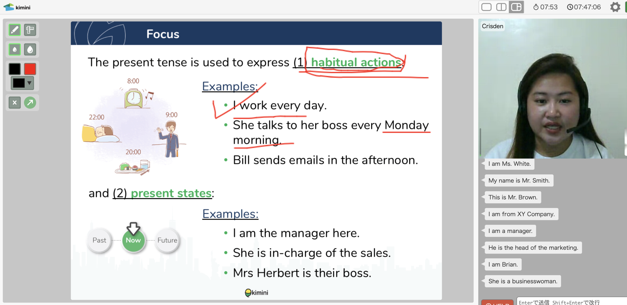 「ビジネス英会話コース1」では、現在形・過去形・未来形をはじめ、疑問詞や句動詞、前置詞、助動詞などの基本的な文法を中心に学びます。
