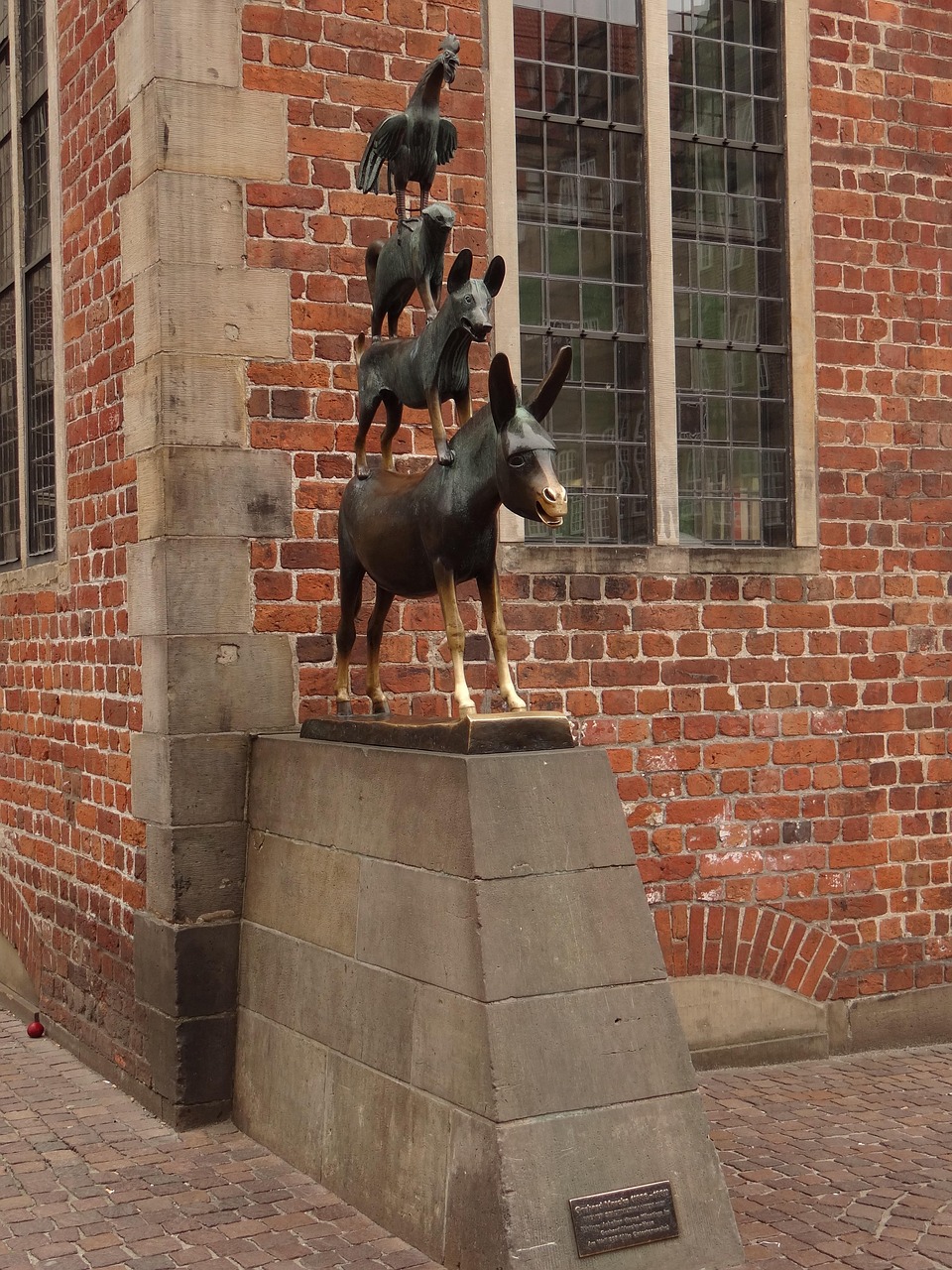 市庁舎の西側の壁にあるのが、『ブレーメンの音楽隊』の像です。ロバの上に犬、その上に猫、そして一番上にニワトリが重なって立っているユーモラスな姿が特徴的です。ロバの前足に両手で触れると願いが叶うという言い伝えもあります。