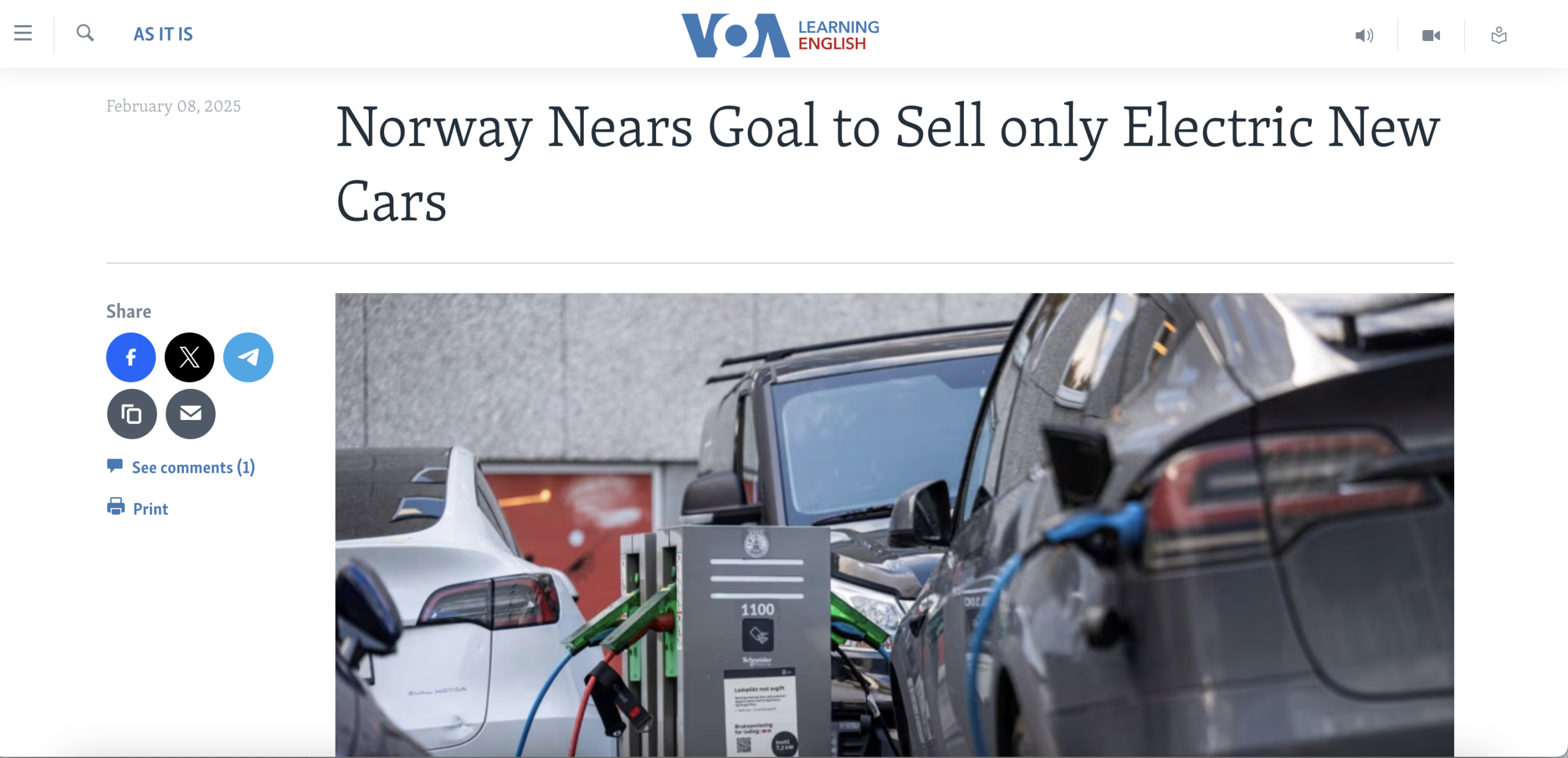 | Topic 1 | Norway Nears Goal to Sell only Electric New Cars ノルウェー、新車販売を電気自動車のみにするという目標達成に迫る |