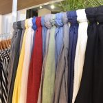 In Japan, scarves are typically displayed by color, pattern, or material, with mirrors and mannequins available to show styling examples.