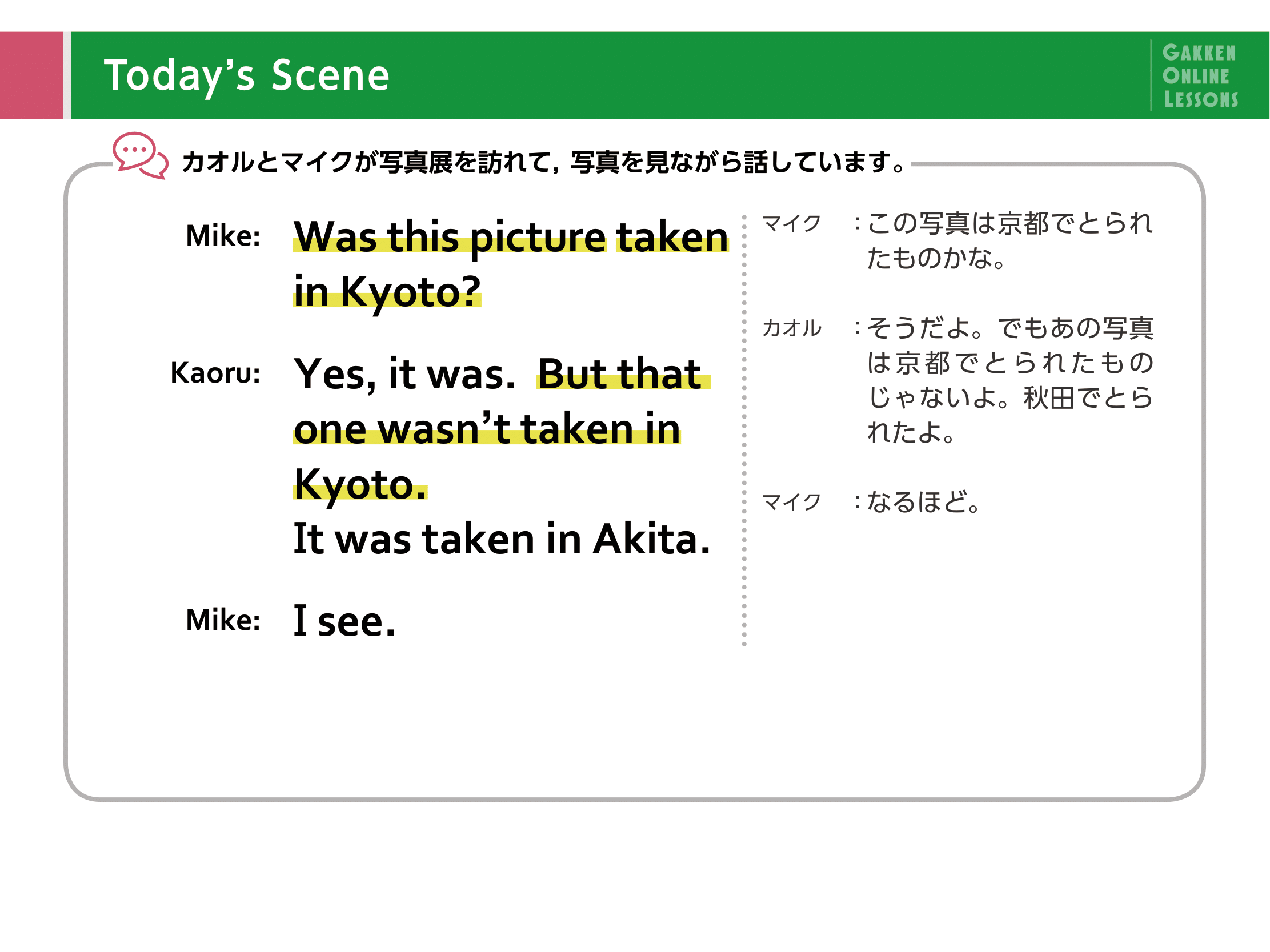 受動態の疑問文と否定文を学習します。「お寿司はフィリピンで売られていますか」といった「~されていますか」という質問をしたり、「この写真は日本で撮られたものではありません」のように「〜されていません」という否定の文を言えるようになります。