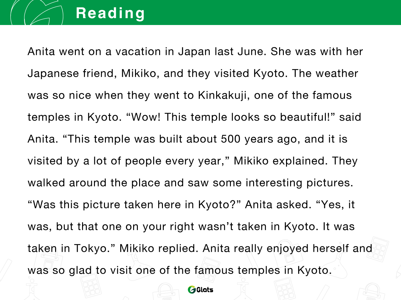 Anita went on a vacation in Japan last June. She was with her Japanese friend, Mikiko when she went to Kyoto.
