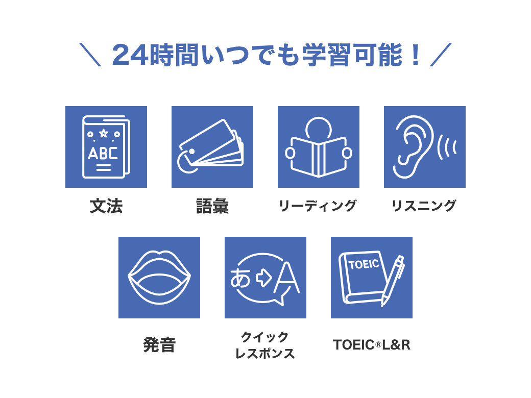 英語スキルを効果的に身につける語彙・文法・リーディング・リスニング・発音・クイックレスポンスを、クイズ形式や発話形式で学ことで、学習の定着と理解を促進します。