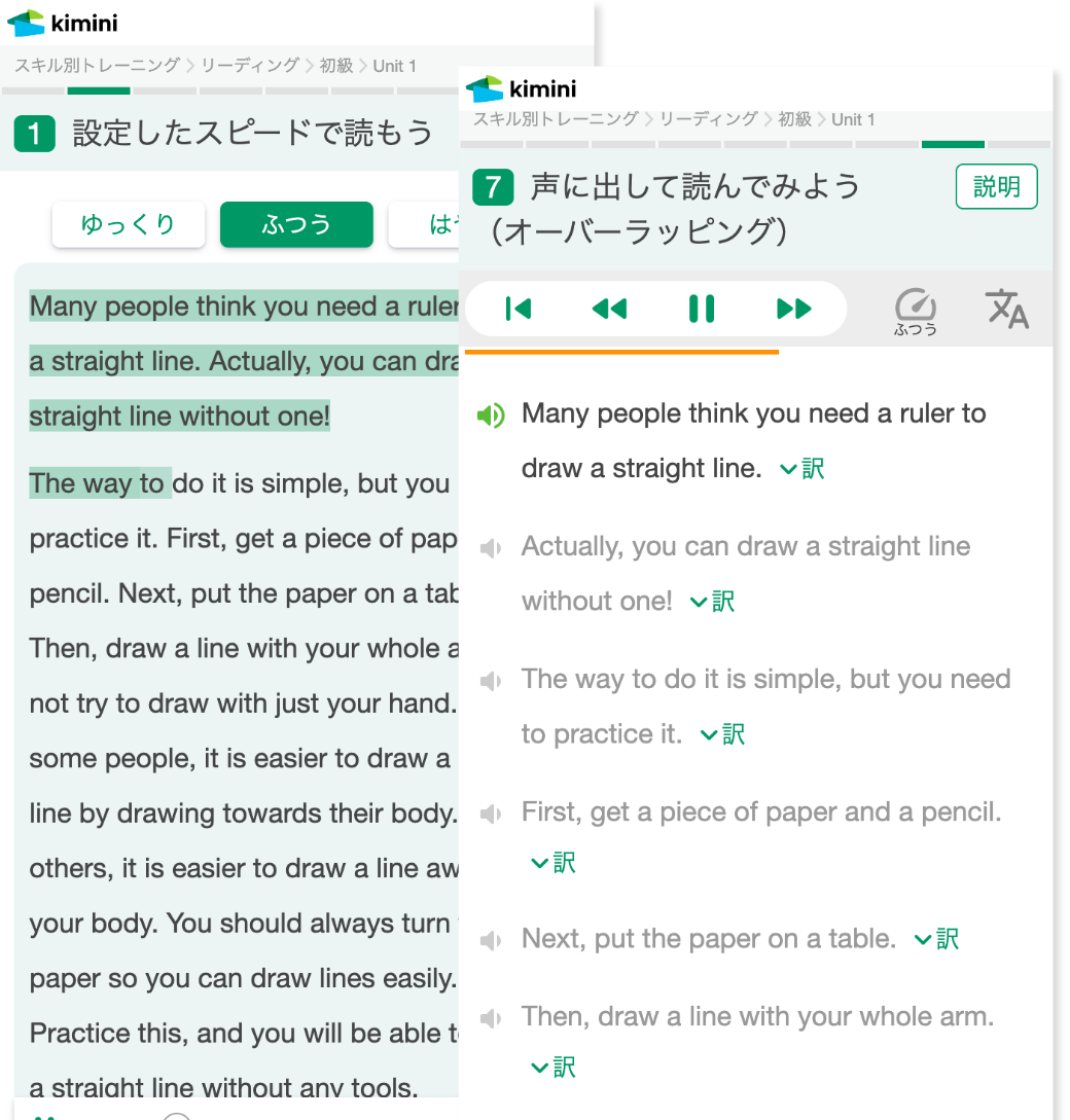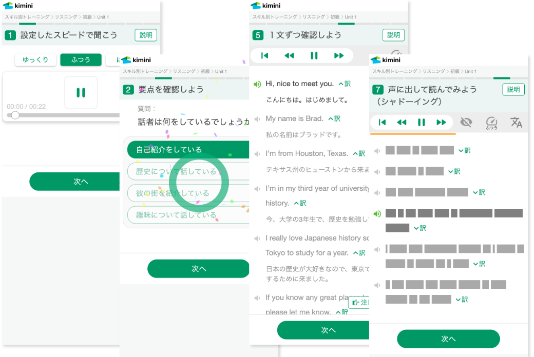 隙間時間で毎日継続毎日英語に触れ続けることが上達のポイントです。通勤・通学時間や家事の合間に学習できるよう、ひとつひとつのトレーニングは短く設定しています。