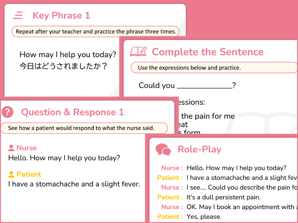 本コースは、書籍『医療スタッフのカンタン実践! 英会話』(株式会社Gakken発行)をもとに制作しており、対応するレッスンの予習で同書掲載の動画もしくは音声を確認したうえで受講することができます。※レッスン内容は一部調整している為、動画・音声と一部異なることがございます。