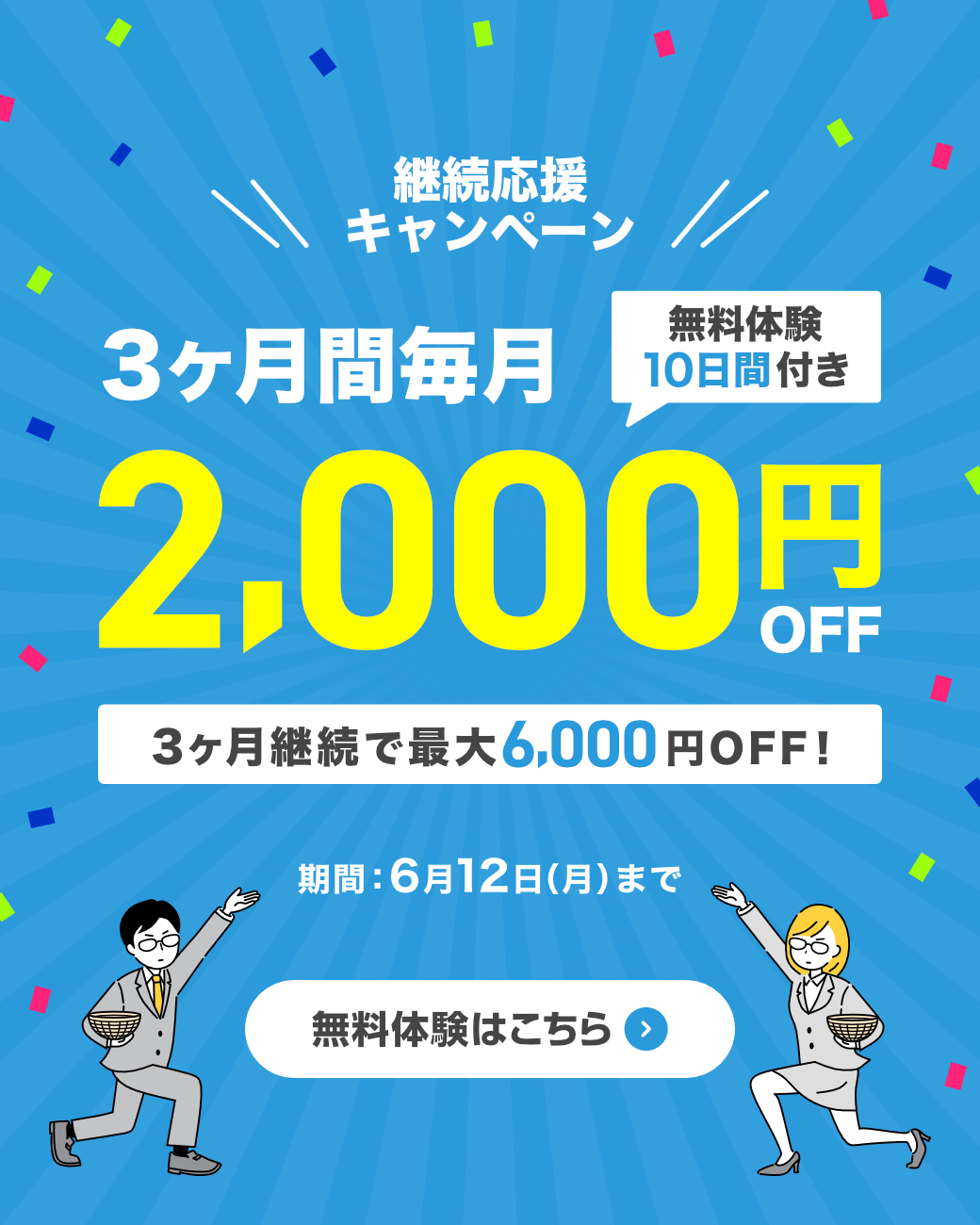 | 特典 | 「3ヶ月間 毎月2,000円割引クーポン」を付与 |