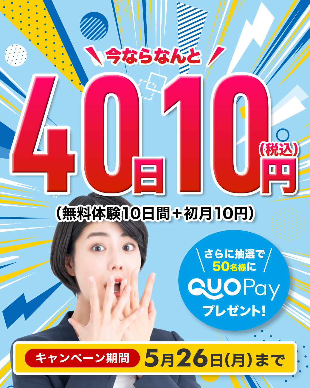 体験料金が実質40日10円(税込)(無料体験10日間+初月10円)※対象プランのみ さらに、抽選で50名様にQuoカードPay2000円分をプレゼント。 |
