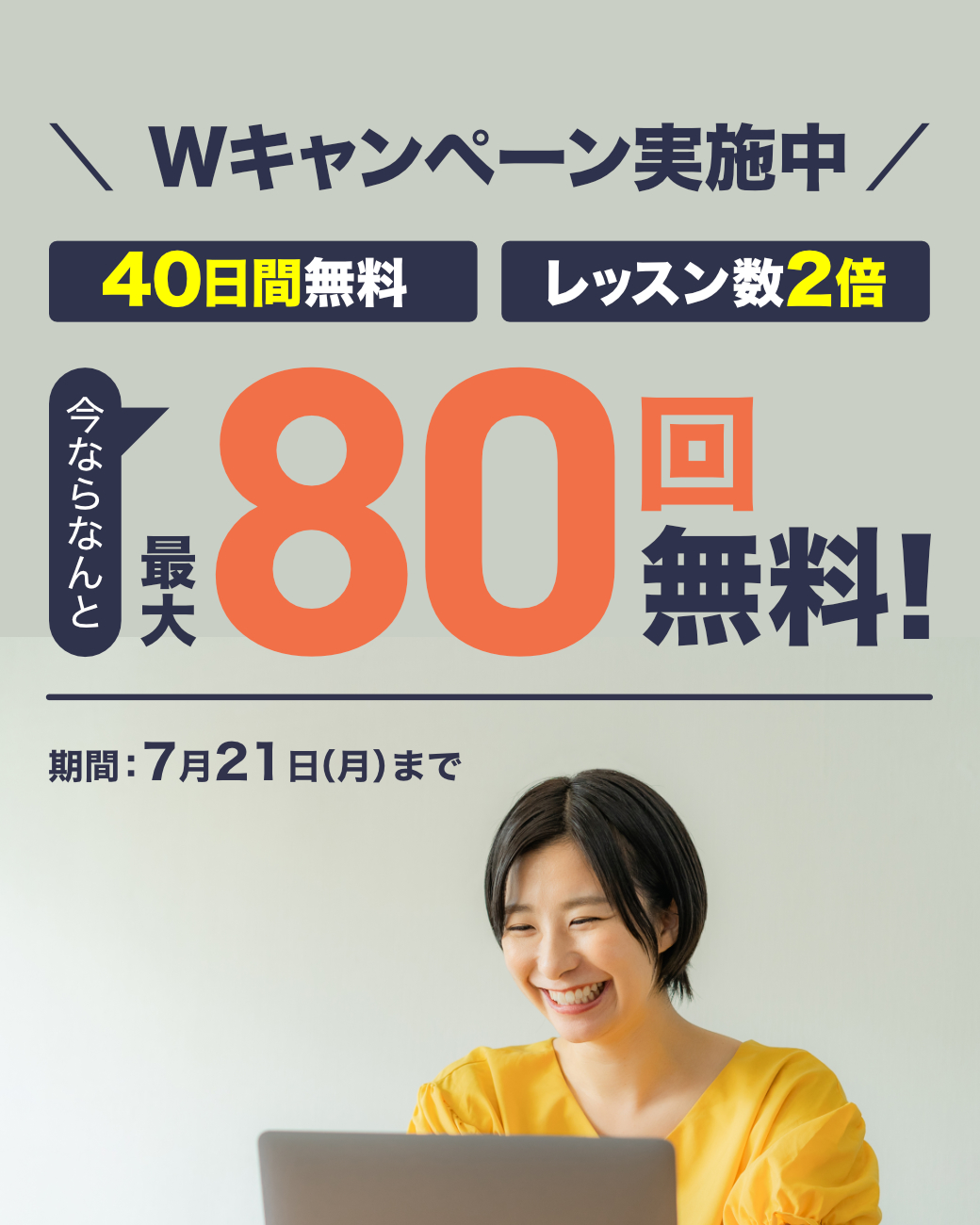 10日間の無料体験を40日間に大爆増 さらに、レッスン2倍キャンペーンと併用で無料期間中、最大80回無料でレッスンが可能に! |