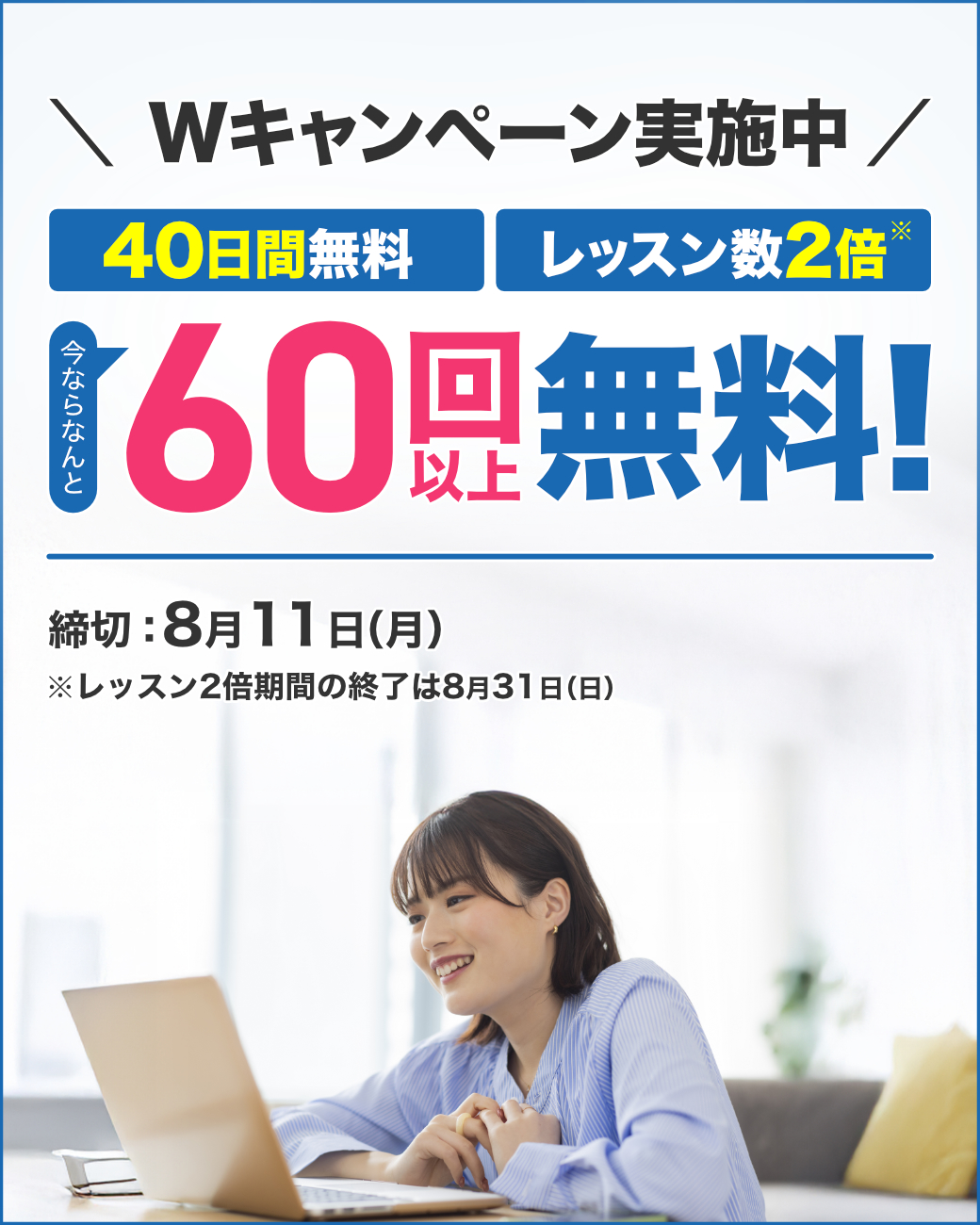 10日間の無料体験を40日間に大爆増 さらに、8月31日までレッスン2倍キャンペーンと併用可能。 7月29日ご入会の方は残り34日間、8月11日ご入会の方は残り21日間 |
