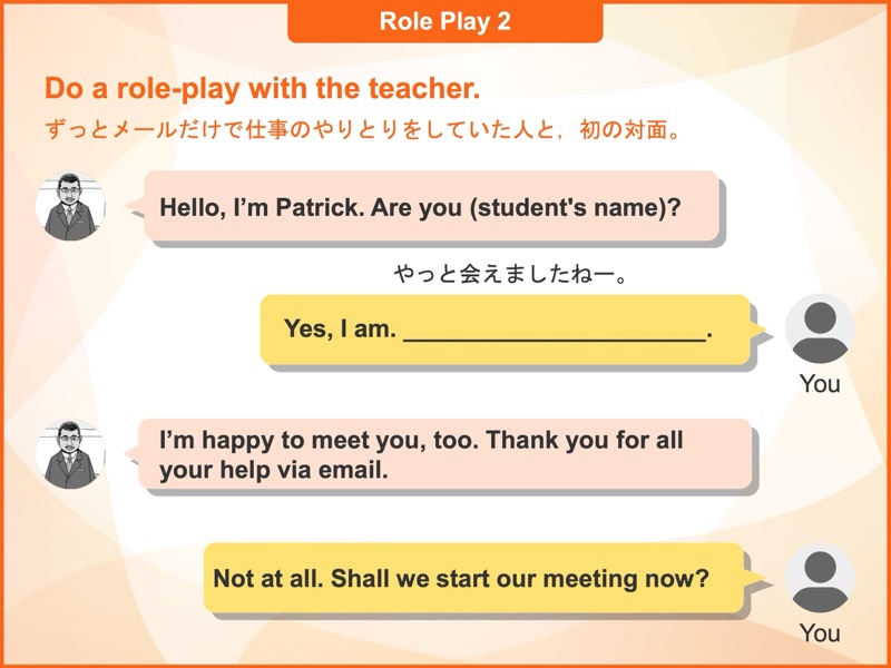 レッスンの始まりに講師と簡単なあいさつをします。講師との初めてのレッスンの場合は簡単な自己紹介をします。