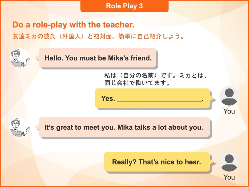 日常生活でよくあるシチュエーションに適した使用頻度の高いフレーズや表現方法を学び、瞬間的に発話できるよう、段階を踏んでトレーニングを行います。何も見ないでフレーズが言えるようになった後は、そのフレーズをロールプレイの中で使ってみます。会話の中でどんなふうに使うのかをイメージしながら練習することで、実践力がより身に付きます。
