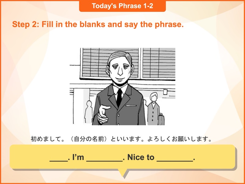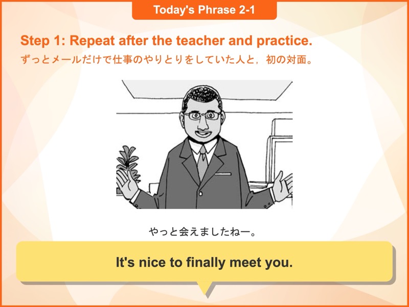 Lesson 1 初対面(1)初めて会う相手とのあいさつや、別れるときのフレーズを学びます。