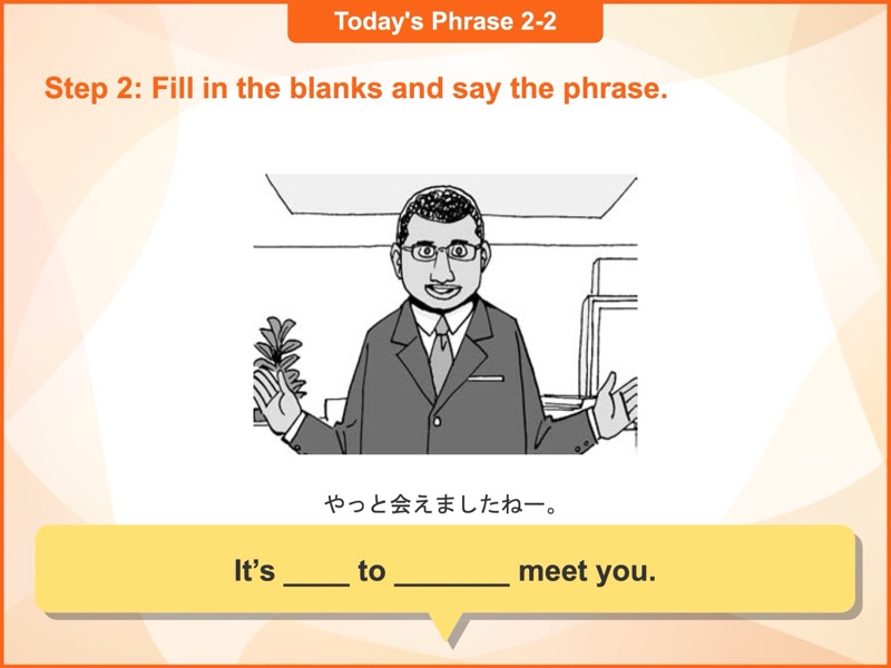 Lesson 2 初対面(2)初めて会う相手とのあいさつや、別れるときのフレーズを学びます。