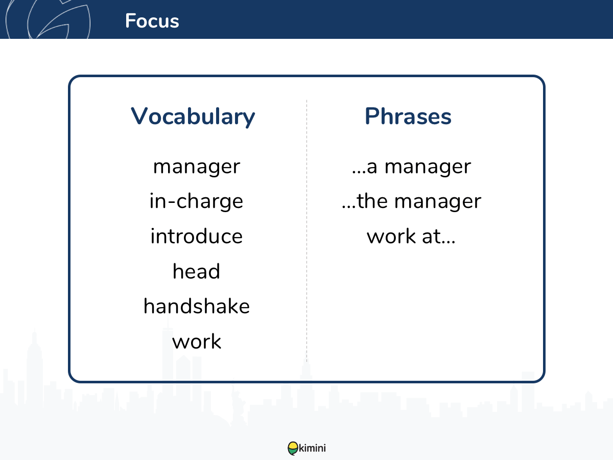 レッスンで学習する文法や語彙・キーフレーズを紹介します。