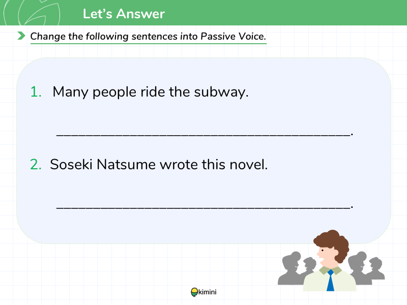 Lesson 1 受動態受動態の文を学習します。「英語は多くの人々によって話されます」「この小説は夏目漱石によって書かれました」のように、「〜される((〜された)・されている」と伝えたり、たずねたりできるようになります。