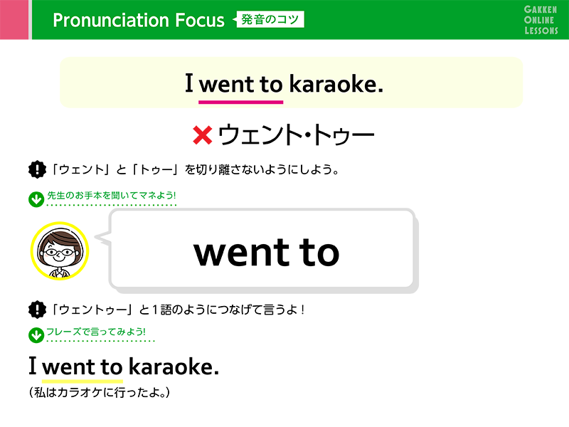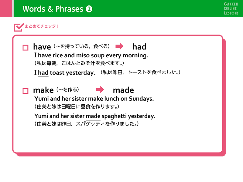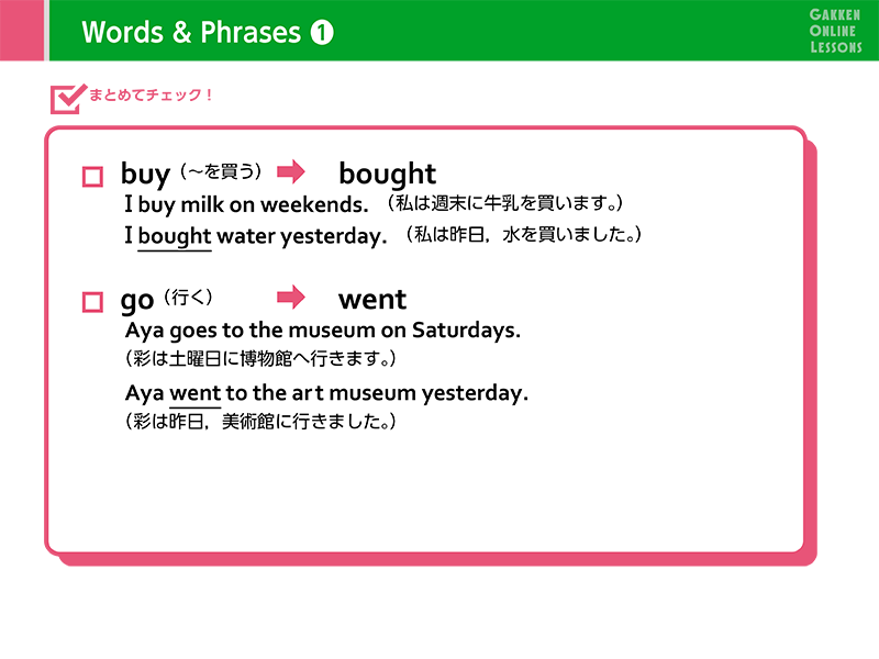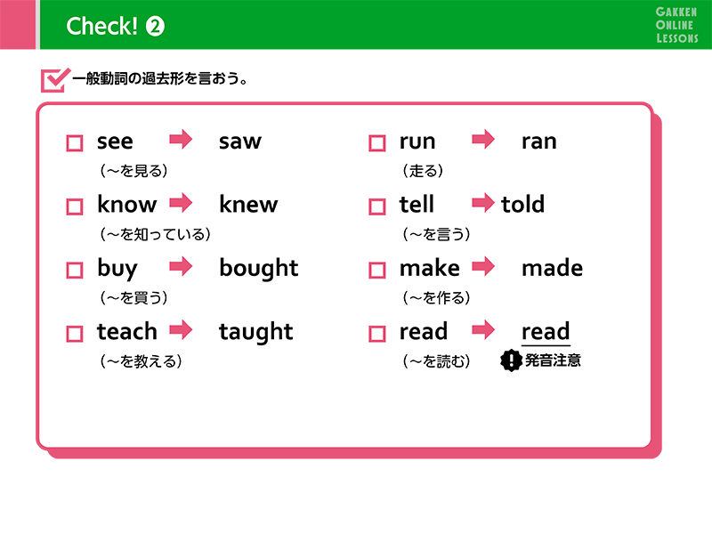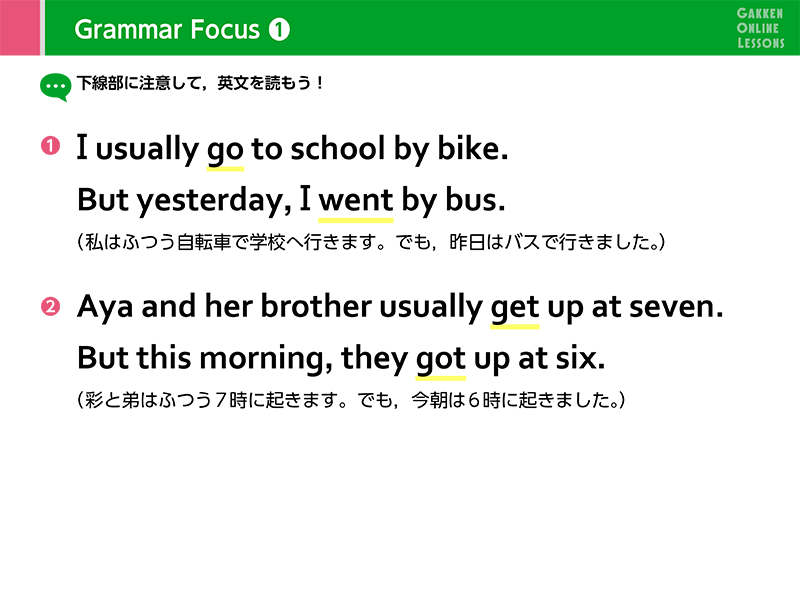 Lesson 1 昨日したことを伝えよう一般動詞の過去形を使った肯定文を学習します。「昨日バスにかばんを忘れました」「先週友達と釣りに行きました」のように、過去にしたことや起こったことについて伝えられるようになります。