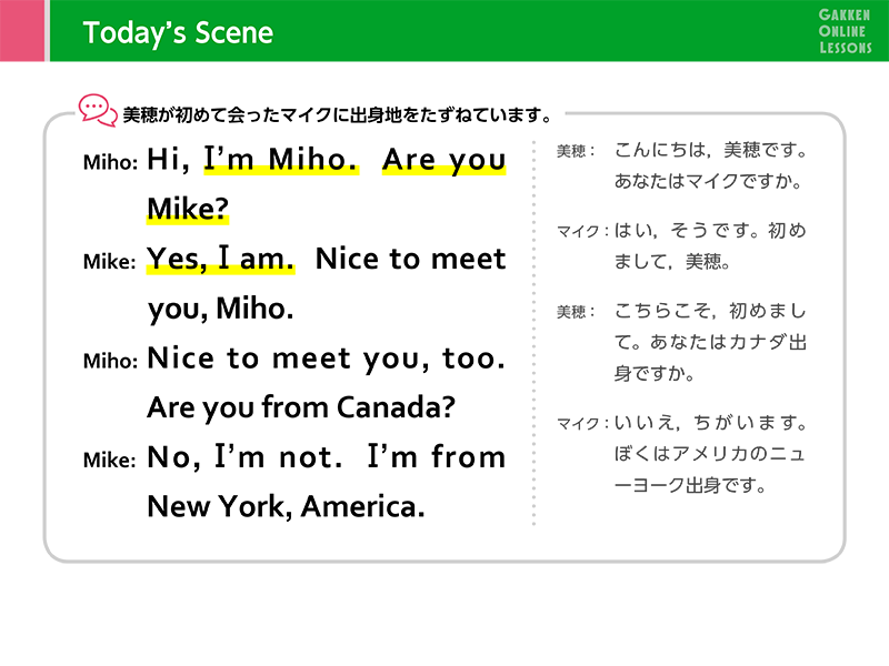 Lesson 9 自己紹介・質問(2)初対面の相手に、自分のことを紹介したり、相手のことについて質問したりするときのやりとりを学びます。