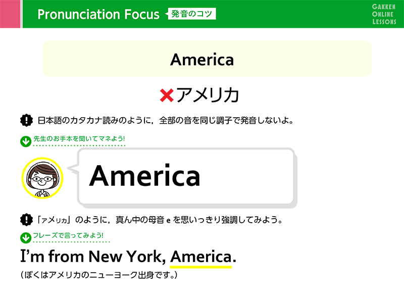 be動詞や一般動詞に重点を置きながら、自分のことを話す練習をします。また、初対面の人との簡単な挨拶や会話を学習します。