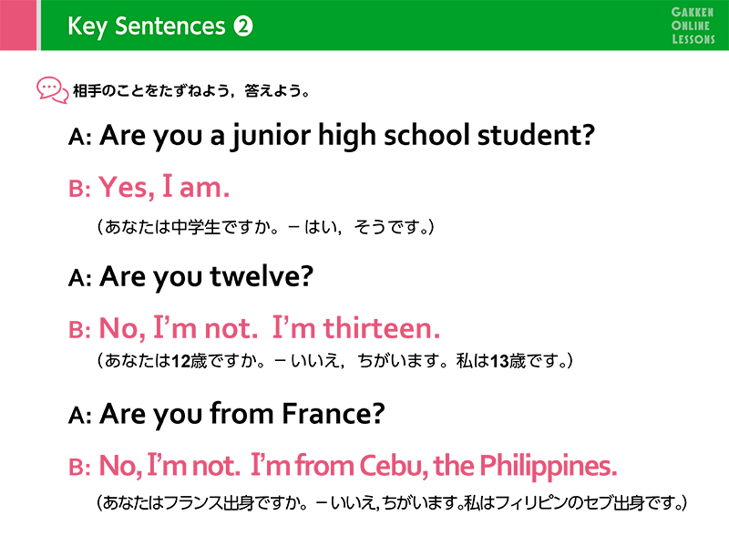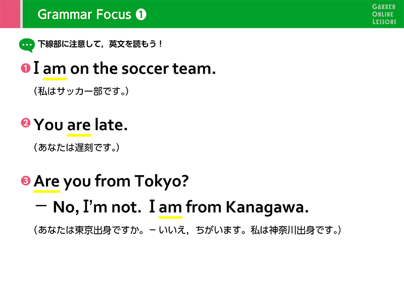 Lesson 1 自分のことを伝えよう、相手のことをたずねようbe動詞を使った肯定文や疑問文を学習します。「私は〜です」「あなたは〜ですか」といった簡単な会話ができるようになります。