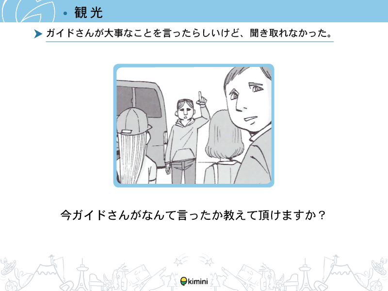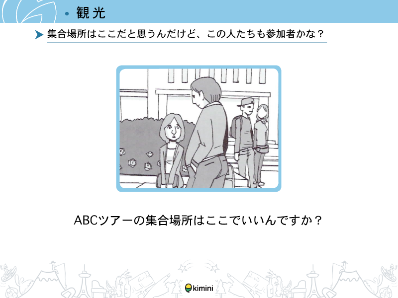 - ツアーなどに参加した際にスタッフや他の観光客と簡単な会話ができる