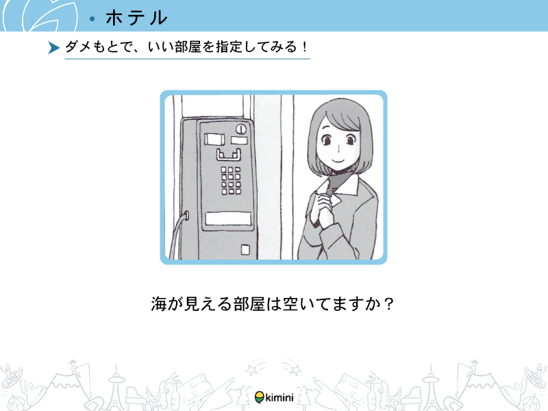 「海が見える部屋は空いてますか?」「エアコンが動かないみたいなのでちょっと見てもらえますか?」「どのお土産が人気ですか?」などすぐに使える実践的なフレーズが満載です!