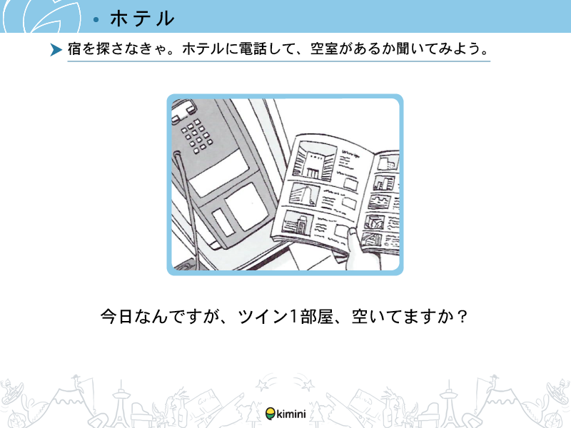 Lesson 1 ホテル(1)予約・チェックイン・チェックアウト・各種サービスの依頼など、ホテルの従業員の人たちとのやりとりを学びます。