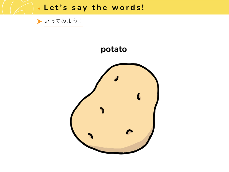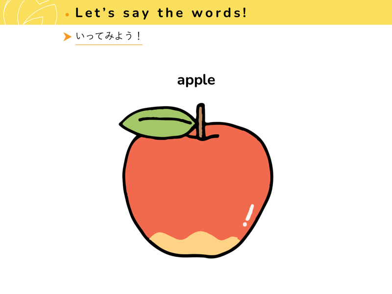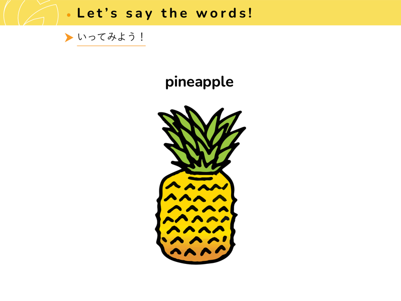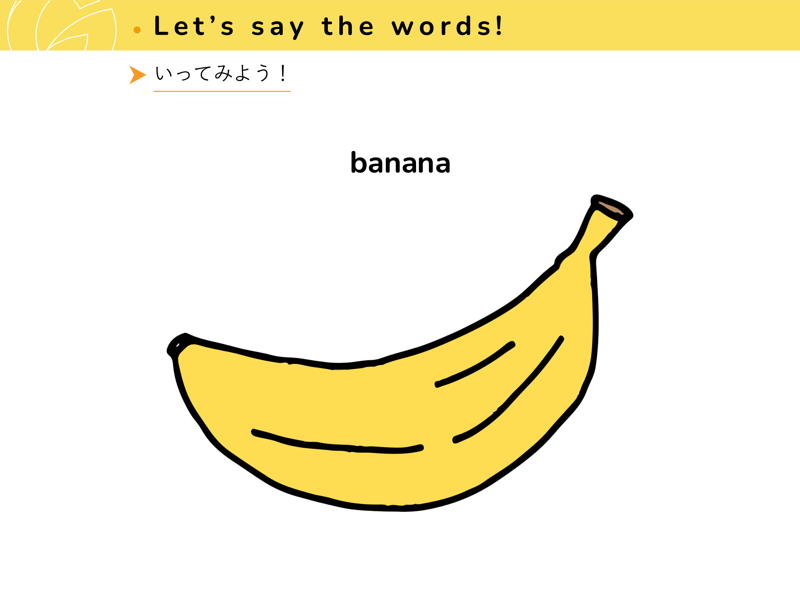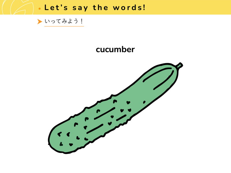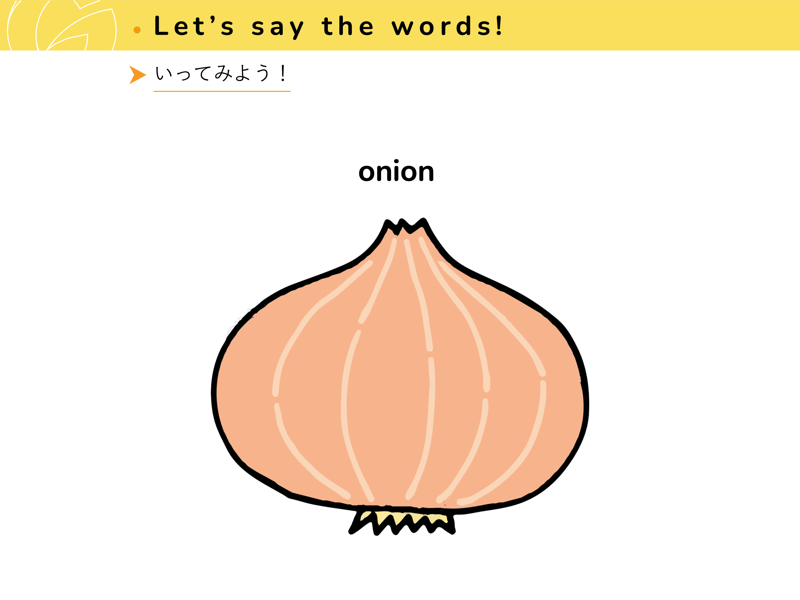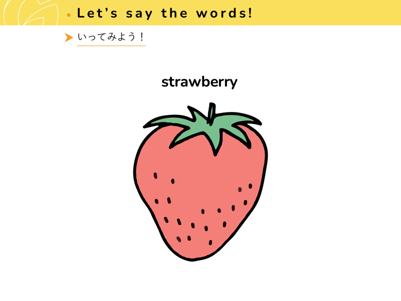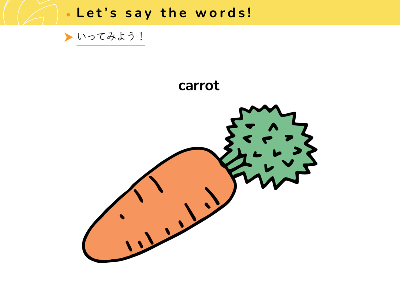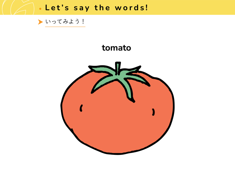 Lesson 1 くだもの と やさいくだものと やさいの なまえを えいごで いってみよう。