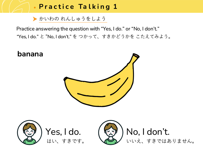 Lesson 4 どんな たべものや のみものが すきですか?すきなたべものや のみものを こたえてみよう。せんせいにも きいてみよう。