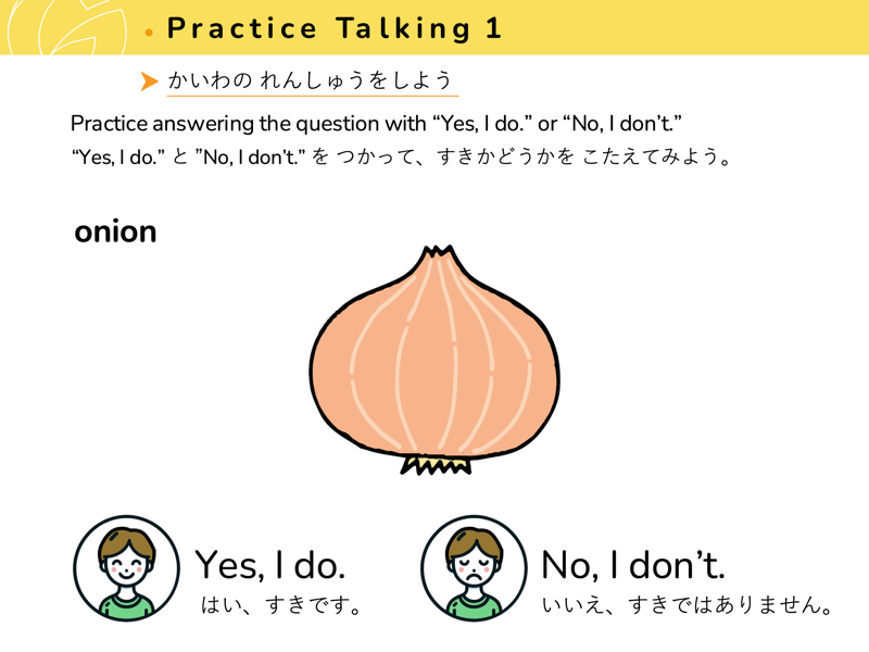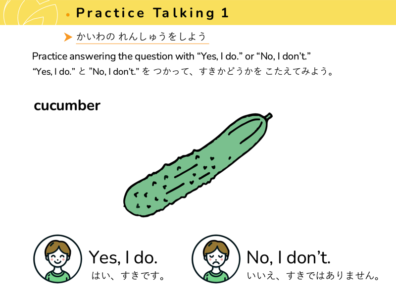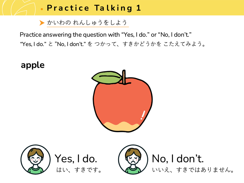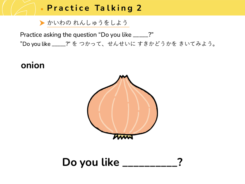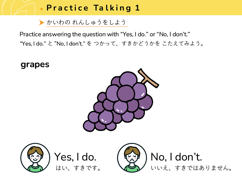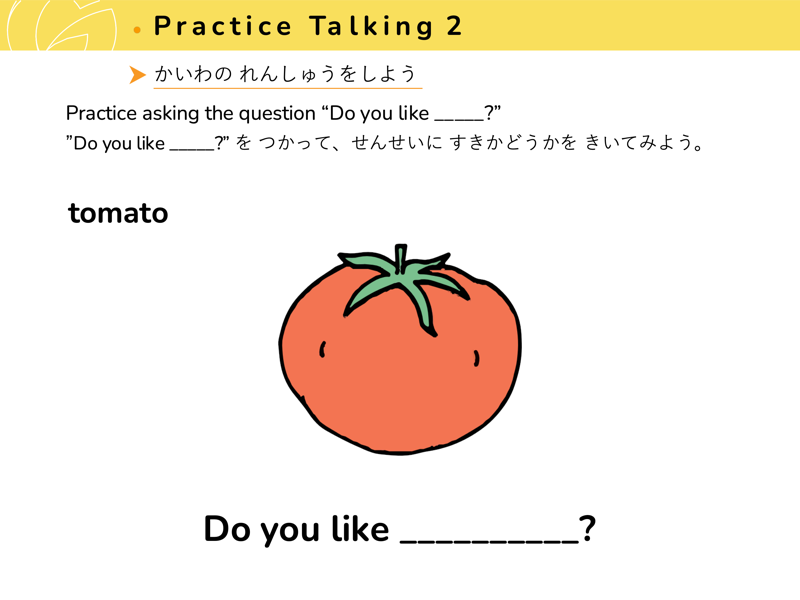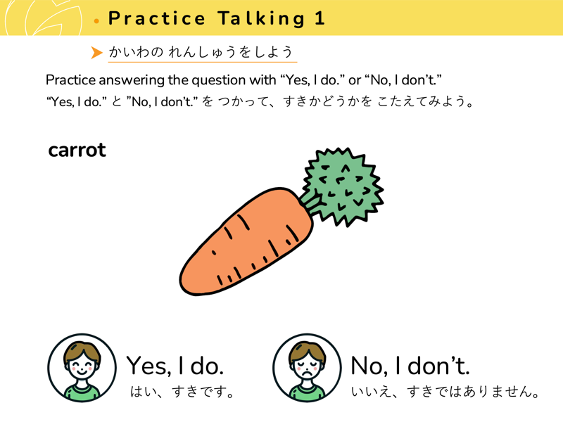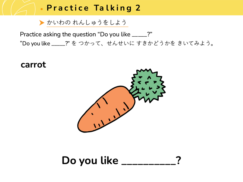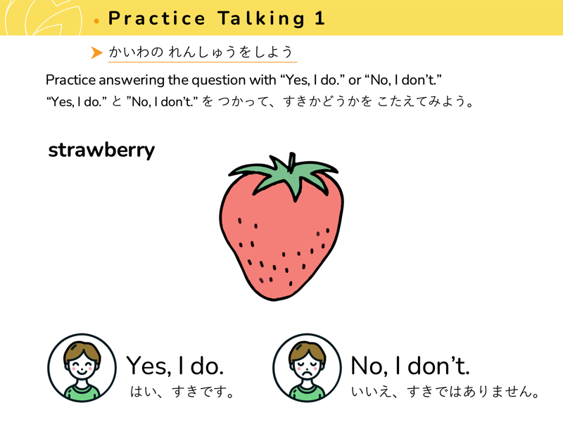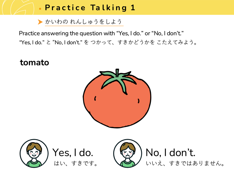 Lesson 3 どんな くだものや やさいが すきですか?すきなくだものや やさいを こたえてみよう。せんせいにも きいてみよう。