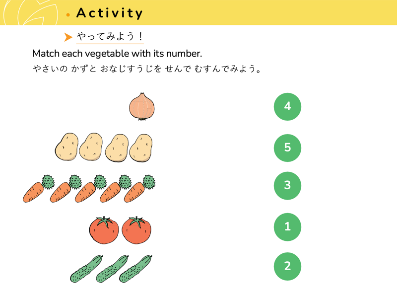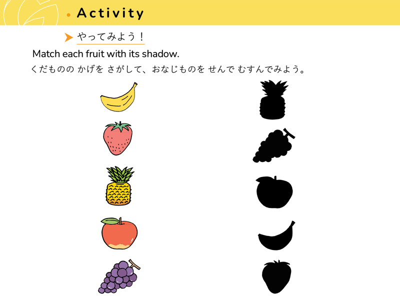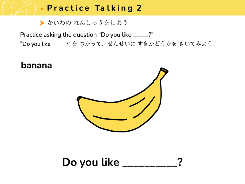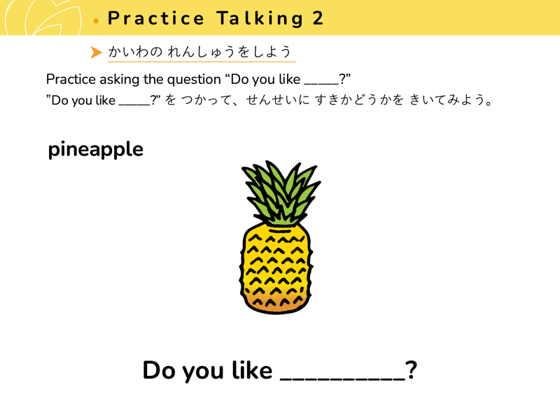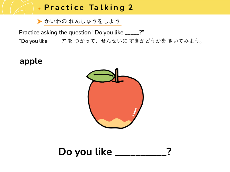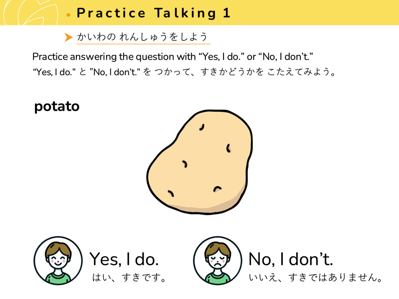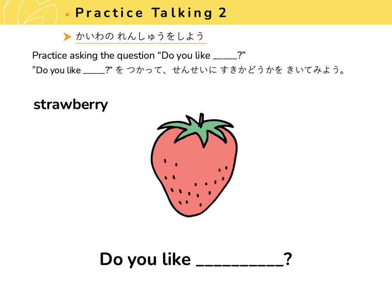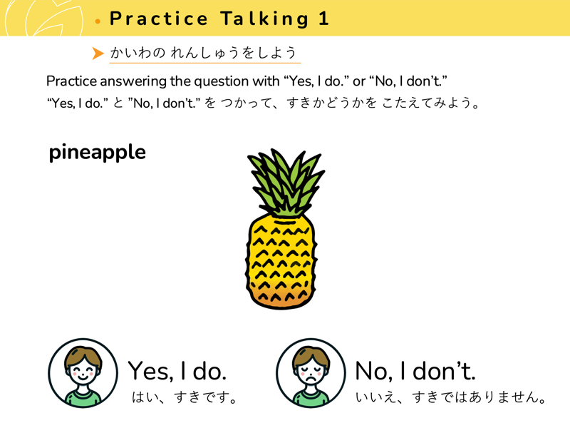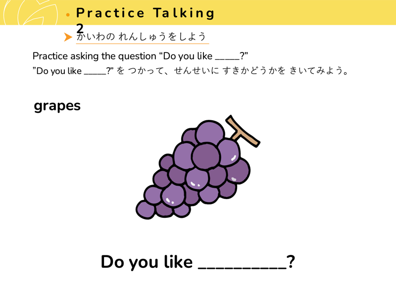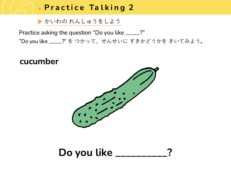 Lesson 3 どんな くだものや やさいが すきですか?すきなくだものや やさいを こたえてみよう。せんせいにも きいてみよう。