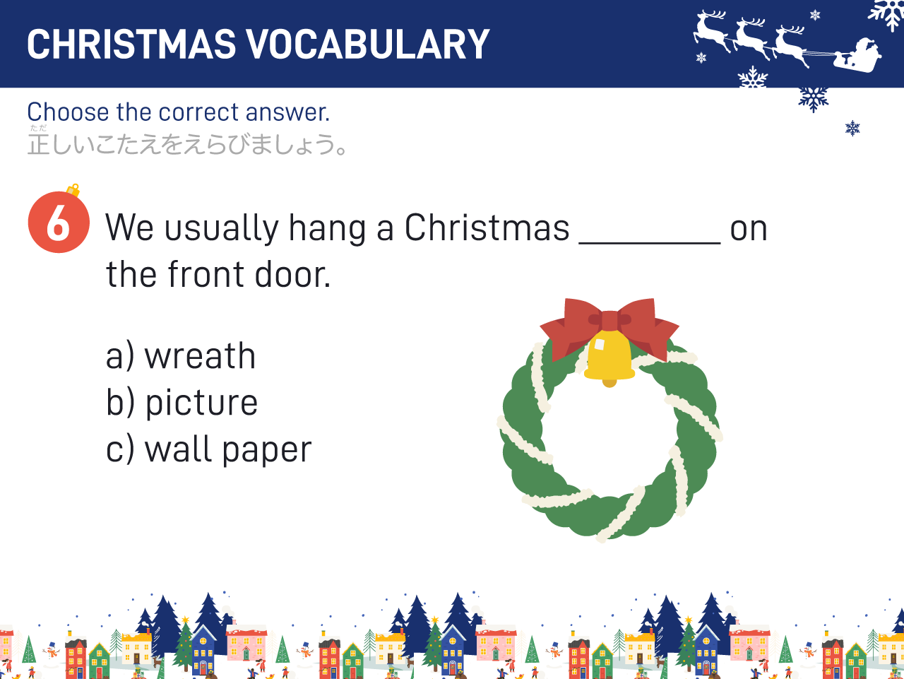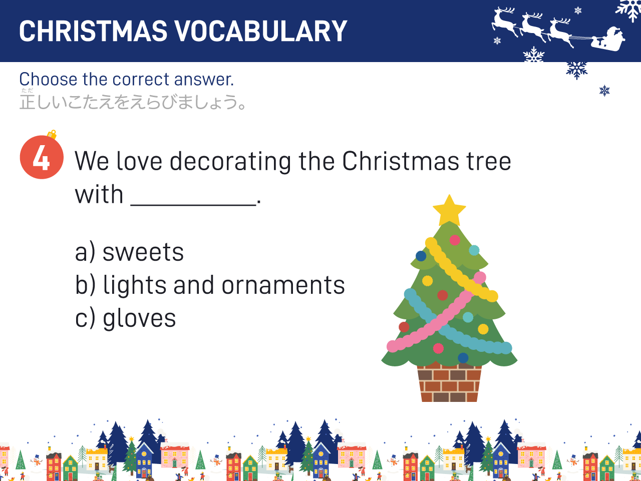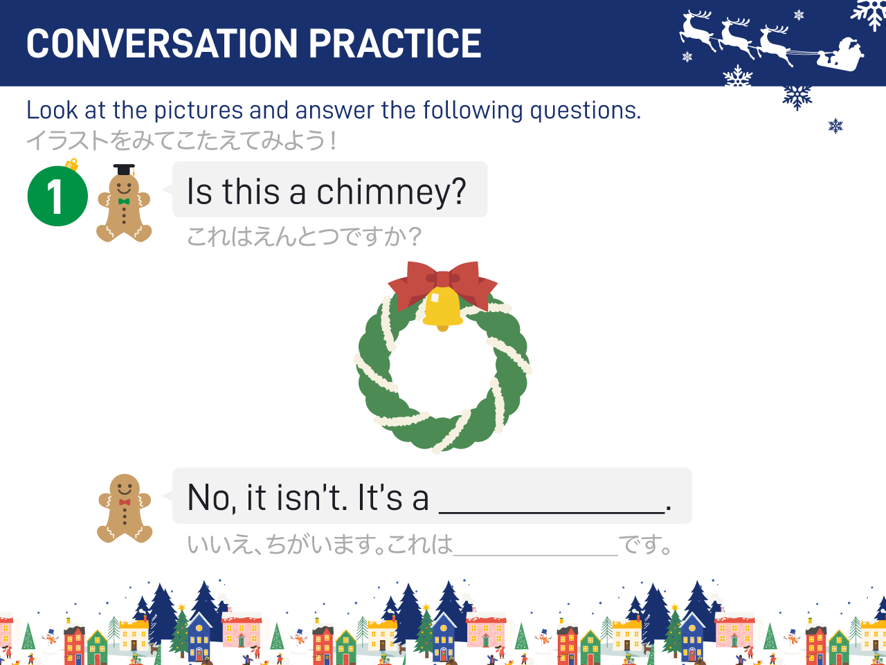 イラストやクイズを使いながら、「サンタクロース」や「トナカイ」などクリスマスにまつわる単語を英語で言えるように楽しく練習します。