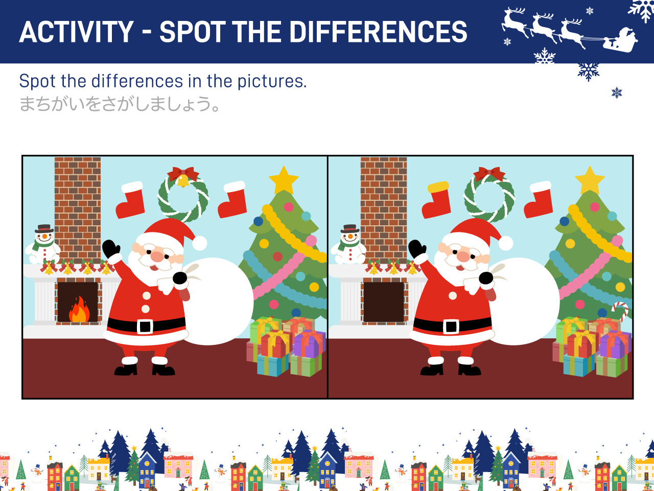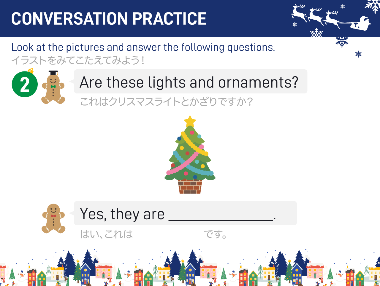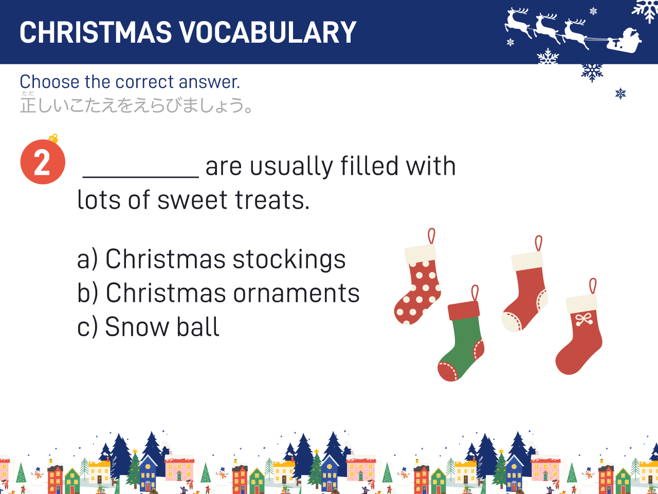 イラストやクイズを使いながら、「サンタクロース」や「トナカイ」などクリスマスにまつわる単語を英語で言えるように楽しく練習します。