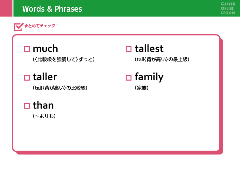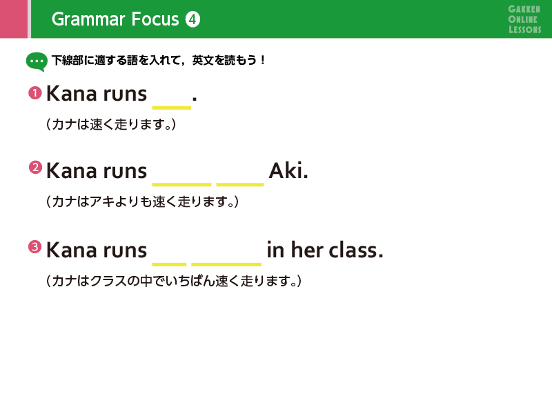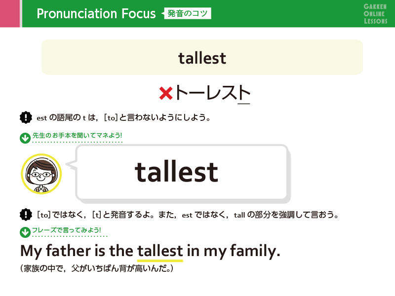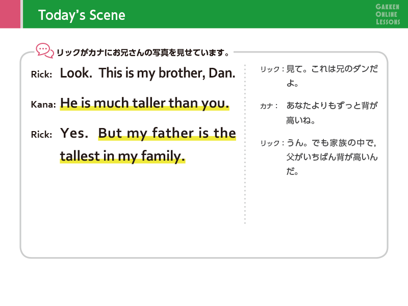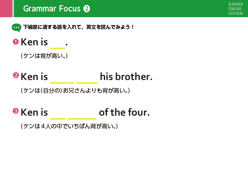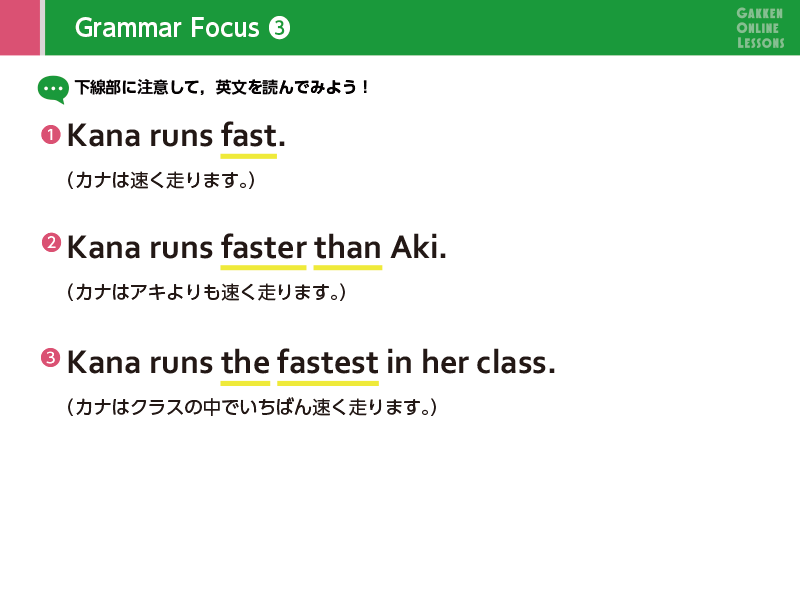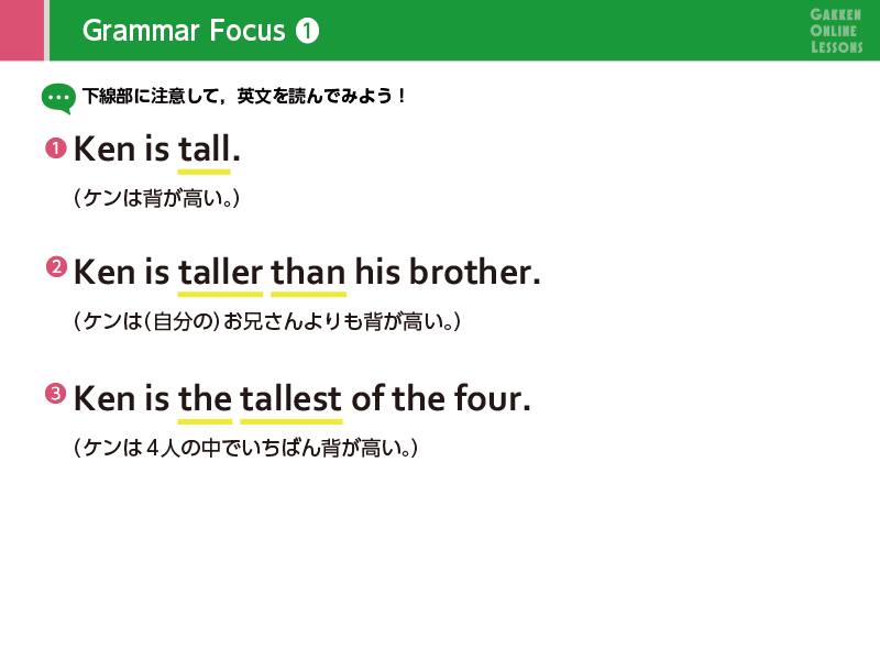 Lesson 4 比べる言い方2つを比べて、「より背が高い」「より速く走る」のように言うときは、tall、fastではなく、最後に er をつけたtaller、fasterの形を使います。この形を比較級と言います。
