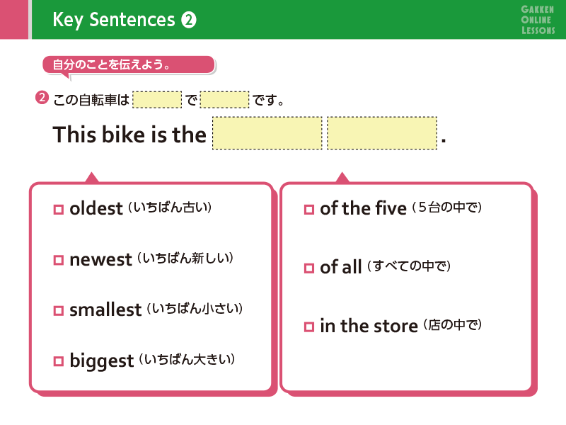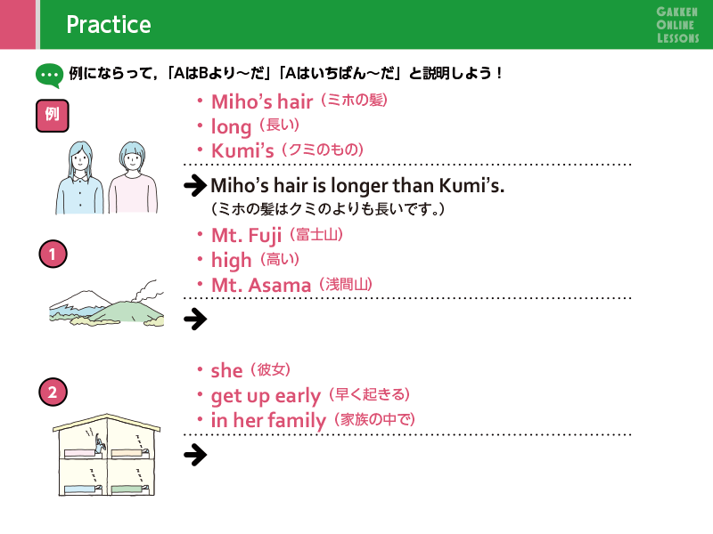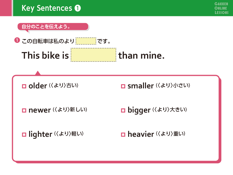 Lesson 1 「…より〜」「…の中でいちばん〜」と伝えよう (1)比較表現について学習します。「それは〜より大きいです」「彼女は~より早く走ります」のように、2つの物または人の様子などを比べたり、「彼は四人の中でいちばん背が高いです」のように、3つ以上の人や物を比べて、その中で誰/何が一番なのかを伝えられるようになります。