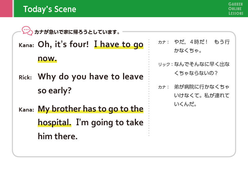 Lesson 1 しなければならないことを伝えよう助動詞 have to を使った文を学習します。「もう行かなくちゃ!」「明日は早く起きなければなりません」のような、しなければいけないことについて伝えられるようになります。