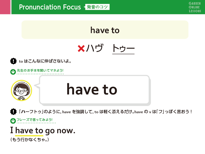 Lesson 4 「〜しなければならない」の文「〜しなければならない」と言うときには、動詞の前にhave toを入れます。
